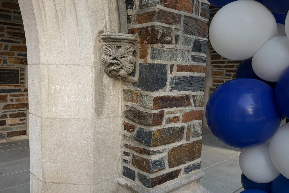 Every six months or so, Jeff traces over faded letters with another piece of white chalk. And every time, he said, it’s obvious that Duke staff use pressure washers to remove scribbles and pound away words and notes carved into the stone while “you are loved” remains.