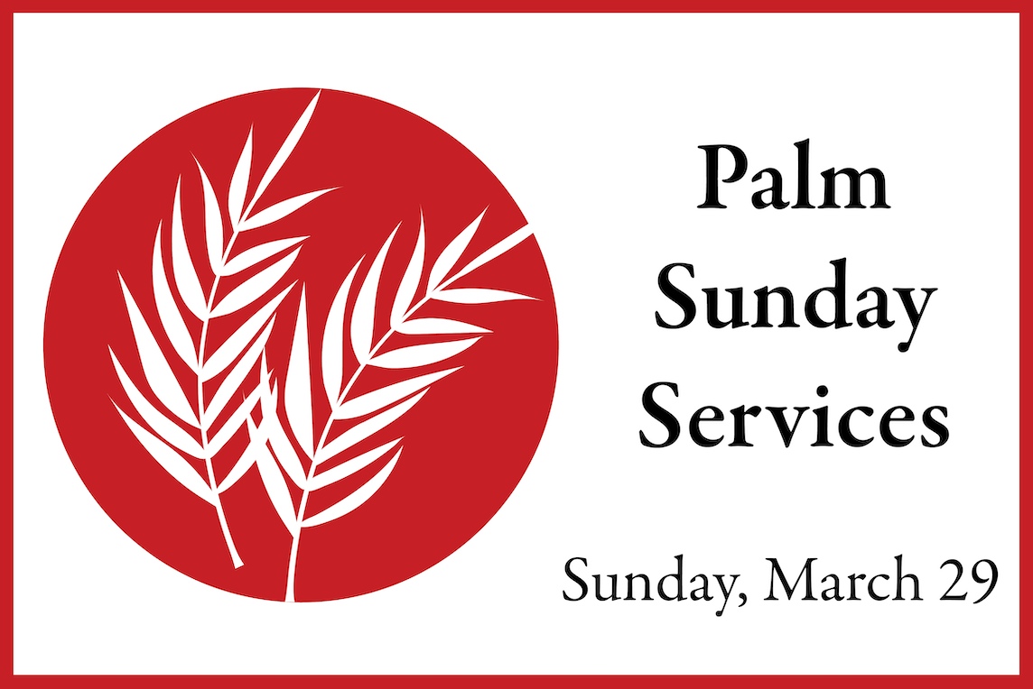We begin Holy Week celebrating Jesus' entrance into Jerusalem at the 8:30 and 11 a.m. services on Sunday, March 29. Each service will begin as a procession with palm branches. Gather at the steps on the Perry Street side. All are invited to participate.